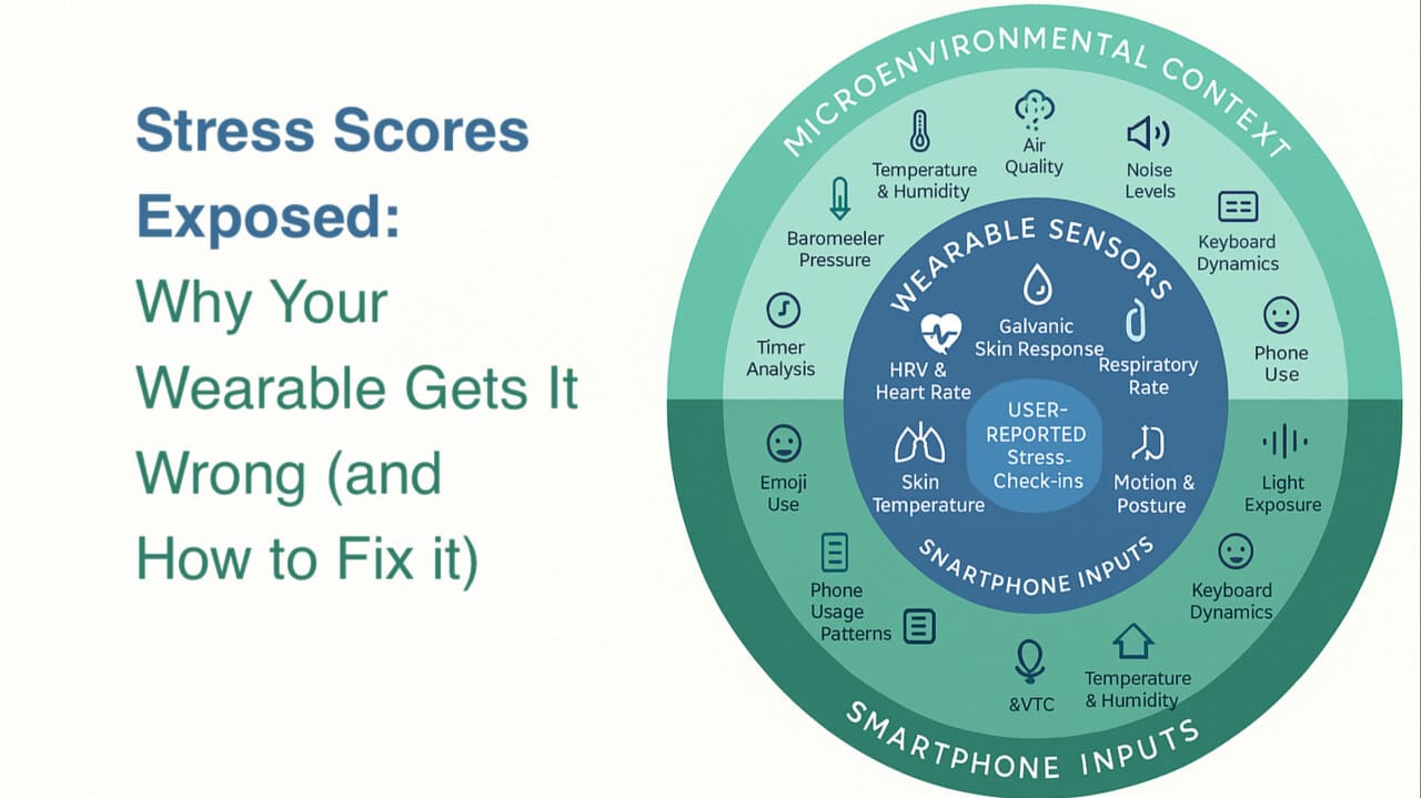 A next-gen stress score should combine physiology (HRV, respiration, skin conductance) + environment (noise, heat, air) + behavior (typing, emojis, speech). By blending signals from wearables + smartphones, we can shift from a single number to a context-aware, personalized model of stress.