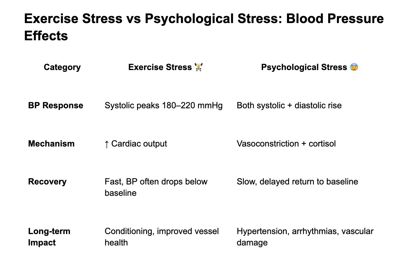 The challenge—and the opportunity—is that a meaningful stress score must untangle these threads rather than blur them together. Below is an example of how blood pressure responds differently to exercise stress versus psychological stress.